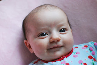 The girl just doesn't cry much, such a happy little camper. She'll whine (not really cry) for a minute or two when I put her down for her naps, but that's pretty much it. Her smiles and coos are absolutely intoxicating, with the choice between chores and hanging out and chatting with her, she usually wins;). She's starting to kick her legs and move her arms in excitement rather than just out of reflex, her whole body smiles!